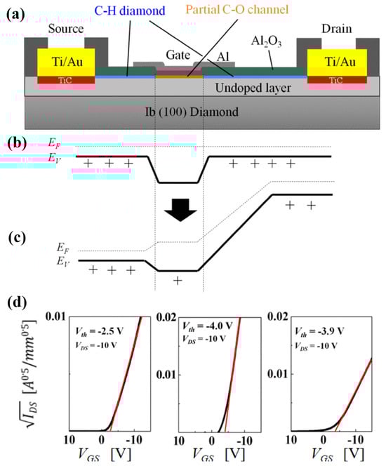 - Liu, J.W.; Liao, M.Y.; Imura, M.; Matsumoto, T.; Shibata, N.; Ikuhara, Y.; Koide, Y. Control of normally on/off characteristics in hydrogenated diamond metal-insulator-semiconductor field-effect transistors. J. Appl. Phys. 2015, 118, 115704. [Google Scholar] [CrossRef]