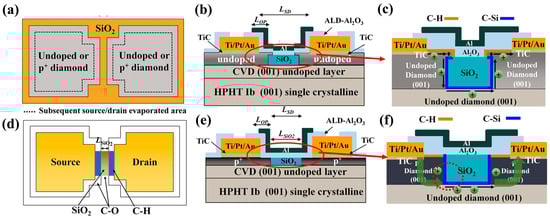 - Liu, J.; Ohsato, H.; Wang, X.; Liao, M.; Koide, Y. Design and fabrication of high-performance diamond triple-gate field-effect transistors. Sci. Rep. 2016, 6, 34757. [Google Scholar] [CrossRef]