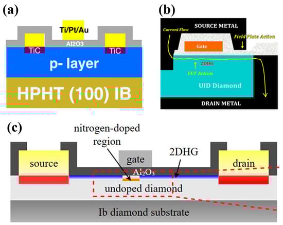 - Kudara, K.; Imanishi, S.; Hiraiwa, A.; Komatsuzaki, Y.; Yamaguchi, Y.; Kawamura, Y.; Shinjo, S.; Kawarada, H. High output power density of 2DHG Diamond MOSFETs with thick ALD-Al2O3. IEEE Trans. Electron. Devices 2021, 68, 3942–3949. [Google Scholar] [CrossRef]