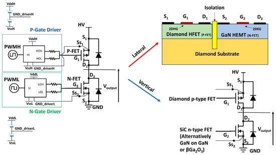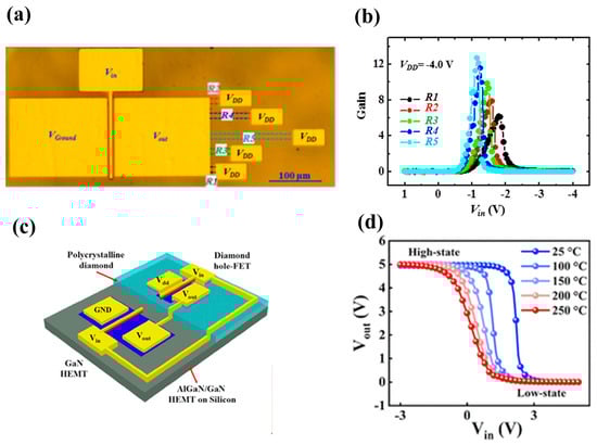 - Ren, C.; Malakoutian, M.; Li, S.; Ercan, B.; Chowdhury, S. Demonstration of monolithic polycrystalline Diamond-GaN complementary FET technology for high-temperature applications. ACS Appl. Electron. Mater. 2021, 3, 4418–4423. [Google Scholar] [CrossRef]