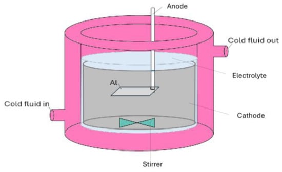 Al templates with an area of 17.2 cm2 were anodized in a 0.3 M oxalic acid (purity ≥ 99.5%, Fisher Chemical, Loughborough, UK) electrolyte using a programmable DC power supply, IT6006C-500-40 (Itech Electronic Co. Ltd., New Taipei City, Taiwan). The anodization process was carried out utilizing a 1 L double-jacketed glass reactor (d = 9.5 cm, h = 14 cm) filled with 0.5 L oxalic acid electrolyte equipped with a cooling system WBL-700 (MRC, Swindon, UK), shown in Figure 1. The cathode material was stainless steel with an area of approx. 184 cm2 (d = 9 cm, h = 6.5 cm). The distance between the magnetic stirred bar and the anode was approx. 3.5 cm. Anodization was conducted at a range of voltages up to 140 V. The pre-anodization was carried out according to the procedure shown in Figure 2, with a voltage sweep rate of ~0.25 V/s up to the final anodization voltage. The experiments were conducted at various temperatures (0, 5, 10, and 15 °C), with a time variation from 1 h to 12 h and a stirring rate of 400 RPM.