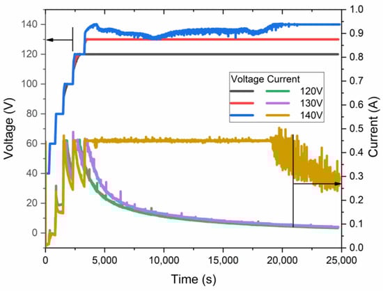 Figure 8. Voltage–current–time relationship of samples anodized at a target voltage of 140 V.