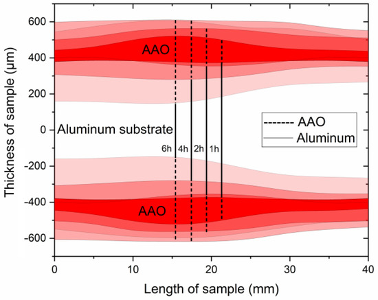 Figure 4. Schematics of the AAO thickness distribution obtained at 0 °C and 140 V at different anodization times.