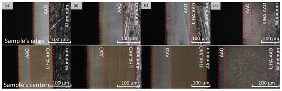 Figure 5. Optical cross-section micrographs of the AAO thickness distribution obtained at 0 °C and 140 V at different anodization times: (a) 1 h, (b) 2 h, (c) 4 h, and (d) 6 h.