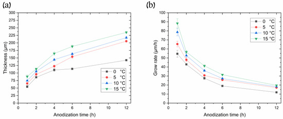 Figure 6. (a) Curves of thicknesses and (b) growth rates of AAO porous films synthesized in 0.3 M oxalic acid at 120 V, utilizing different temperatures as a function of anodization time.