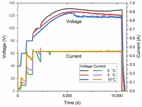 Simultaneously, an increase in the electrolyte temperature facilitates a decrease in the maximum anodization voltage, as shown in Figure 8. The curves in this plot present the electric behavior of three samples anodized at a target voltage of 140 V at different temperatures. Although the processes did not reach the target voltage, the electrolyte temperature affects the maximum voltage for anodization. The maximum constant pre-UHA voltage of ~128 V, ~127 V, and ~125 V was reached at 0 °C, 5 °C, and 10 °C, respectively.