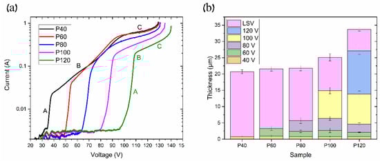 The LSV test was carried out on samples with different pre-anodization procedures, as described in Table 1. The obtained curves show the following three typical modes of anodization: kinetic, mixed, and diffusion [16,22,23]. The kinetic and diffusion modes may be fitted by line in Figure 9a. In area A (MA), the anodization rate is limited by the chemical and electrochemical processes’ kinetics at the pore bottoms under the applied electric field. Area B (mixed mode anodization) includes the diffusion limit of ions through the AAO pores, along with the kinetics of ion transport at the solid/electrolyte interface. In contrast, area C (HA) describes the ion diffusion limit due to the high ion content at the AAO pore bottom, which is also agreed upon in [16]. The continuation of area C, where the linear region ends, represents the maximum voltage before the anodization process transitions to UHA or even the plasma electrolytic oxidation (PEO) zone. As seen in Figure 9a, the pre-anodization procedure can shift the anodization modes to higher voltages and increase the maximal voltage. Thus, in the P40, P60, P80, P100, and P120, the kinetic mode begins at 35 V, 50 V, 65 V, 80 V, and 95 V, respectively. Furthermore, we observe that the kinetic limit area (area A) increases with the increasing thickness of the coating developed during the pre-anodization procedure. Concurrently, the mixed mode range decreases with the longer pre-anodization procedure, as indicated by the change in area B on the curves from P40 to P120. It can be seen in Figure 9b that the layer thickness at each pre-anodization step is almost similar across all of the samples. However, the thickness of the LSV coating layer reduces as more pre-anodization steps are applied. This phenomenon may be addressed to the reduction in the current density with the anodization voltage, as seen in Figure 9. Consequently, pre-anodization introduces additional growth limitations, shifting the diffusion mode to higher values. This permits using a higher anodization voltage, the so-called pre-UHA mode, especially at elevated temperatures where the voltage range for the pre-UHA is broader, resulting in a higher growth rate than HA at lower voltages [15].