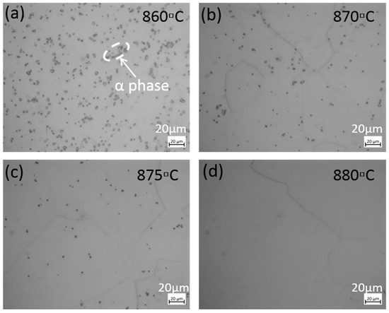 From the extension line of the trend of phase-fraction variation, one can determine that the α + β/β phase-transition temperature is between 875 °C and 880 °C for Ti555211 titanium alloy ingots. The microstructure analysis confirms that the α phase completely disappears under the 880 °C treatment (Figure 1d).
