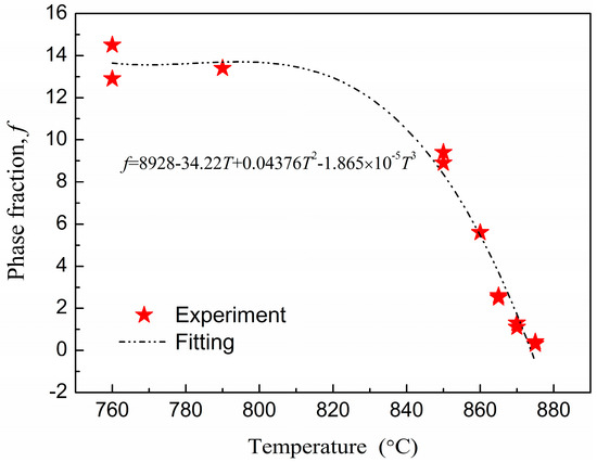 The temperature of α + β/β transition in titanium alloy, Tβ, has been defined as the lowest temperature at which all α-phase grains disappear from β matrix. To determine Tβ for Ti555211 titanium alloy, the metallographic method was used to observe phase fractions of α + β and β phases in the microstructure. In accordance with the national standard of the People’s Republic of China GB/T 23605-2020 for the metallographic method, the main requirements are: (1) First of all, ensure that the temperature uniformity of the electric furnace used for heat treatment specimens is ≤3 °C; (2) The size of all specimens is guaranteed to be consistent, with a diameter of 10 mm ± 1 mm and a height of 15 mm ± 1 mm; (3) Metallographic assessment is assessed according to the standard (the test surface of the sample should be able to better represent the entire cross-sectional structure of the material. Considering the influence of microstructural fluctuations in different parts of the sample on the microstructure, at least five fields of view should be observed at the center and half radius of the sample, and a representative field of view should be selected to determine the content of phase A. The determination of phase content can be done using an image comparison method, image analysis software (Image J, https://www.statistical-analysis.top/ImageJ/Details.html?bd_vid=9848313351479648088, accessed on 9 May 2024), or calculation method, and the selected image magnification should be consistent). The specimen holding time is 35 min ± 5 min. The holding time was calculated from the time when the effective working area of the furnace reaches the set temperature. After treatment the sample is cooled by water quenching. The metallographic structure of Ti555211 titanium alloy samples after different temperature treatments are obtained as shown in Figure 1. The higher the temperature, the less α phase can be observed. Then, α-phase fractions corresponding to different temperatures are quantitatively measured as shown in Figure 2, with the trend of α-phase fraction and temperature variation extrapolated using a simple polynomial function.