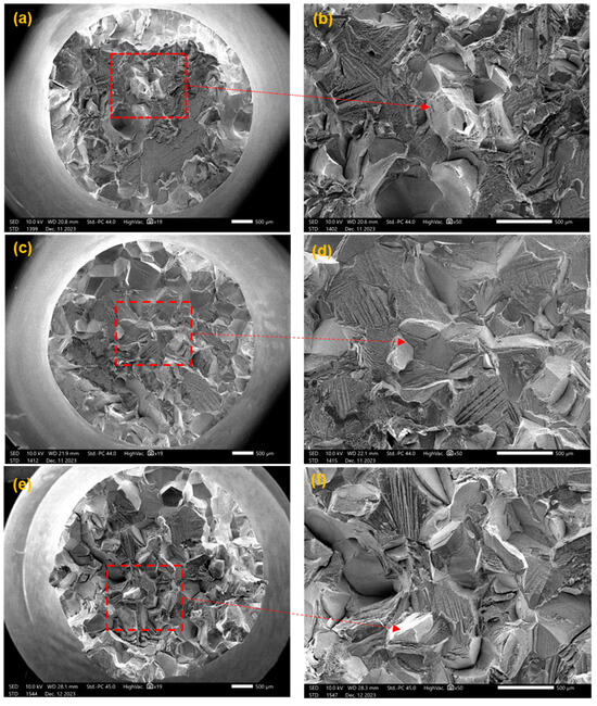 Fracture morphology of solid-solution and aging treatment sample: (a,b) Sample 7, 760 °C/2 h AC and 620 °C/8 h AC; (c,d) Sample 8, 800 °C/2 h AC and 620 °C/8 h AC; (e,f) Sample 9, 840 °C/2 h AC and 620 °C/8 h AC.