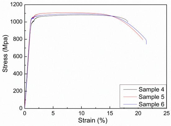 The solid-solution and aging heat treatment process can often simultaneously improve the strength and ductility of materials. According to the process in Table 1, The sample was subjected to solid-solution and aging treatment, and after that tensile testing was performed. The obtained tensile curve is shown in Figure 8. The summary of its tensile performance is shown in Table 4.