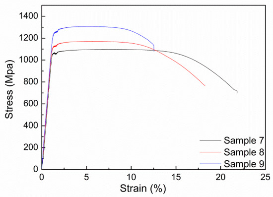 Due to the fact that solid solution and aging can achieve better strength performance, after repeated experiments on the sample, Sample 10 with higher strength and a certain elongation rate was finally obtained. Its maximum tensile strength can reach 1404 MPa, and the elongation rate remains at 11%. Its heat treatment process is 820 °C/2 h, AC and 560 °C/12 h.