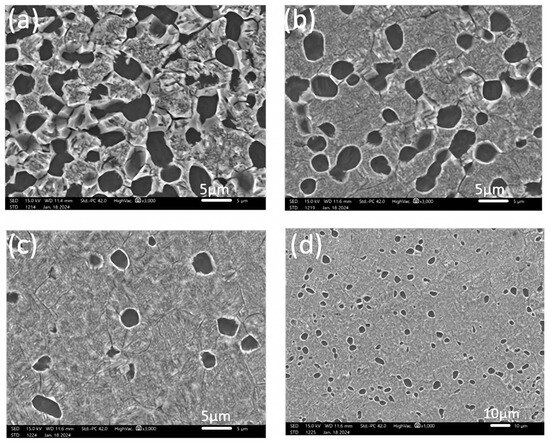 Figure 9 shows the fracture structure after solid-solution and aging treatment. It can be seen that there are many small ductile dimples on the fracture surface of the sample, which is a characteristic of detailed ductile fracture. However, there are still slight differences in the number and size of ductile dimples among these samples, indicating a certain difference in strength and toughness of the samples. By comparing the tensile strength listed in Table 4, it can be observed that the dimples in Figure 9f are the smallest, most numerous, and have the highest strength.