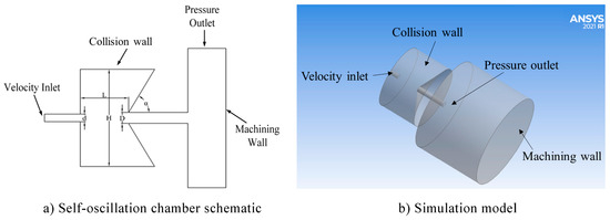 Schematic of self-oscillation chamber and boundary conditions. (a) Self-oscillation chamber schematic. (b) Simulation model.