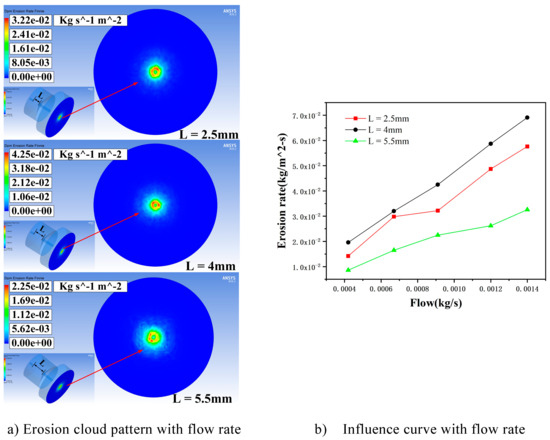 In the case of when the inlet velocity is 135 m/s, the particle size is 5 μm, and the particle mass flow rate is 0.00042 kg/s, 0.00067 kg/s, 0.00091 kg/s, 0.0012 kg/s, and 0.0014 kg/s. Simulations were carried out for three cavity lengths of L = 2.5 mm, 4 mm, and 5.5 mm, respectively, to study the effect of particle mass flow rate on the erosion results of the machined wall, and the simulations were taken to be analyzed when the flow rate was 0.00091 kg/s. The erosion distribution is shown in Figure 5a, and the curve of the effect of the maximum erosion rate is shown in Figure 5b.