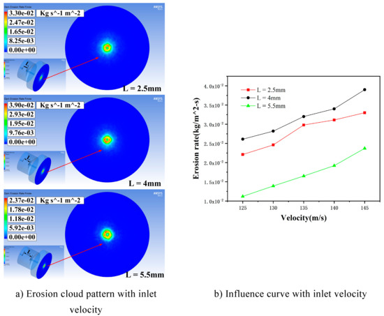 For a particle size of 5 μm, the particle mass flow rate is 0.00067 kg/s and the inlet velocity is 125 m/s, 130 m/s, 135 m/s, 140 m/s, and 145 m/s. Simulations were carried out for three cavity lengths of L = 2.5 mm, 4 mm, and 5.5 mm, respectively, to study the inlet velocity on the erosion results of the machined wall, and the simulations were taken to be analyzed when the entrance speed was 145 m/s. The erosion distribution is shown in Figure 6a, and the curve of the effect of the maximum erosion rate is shown in Figure 6b.