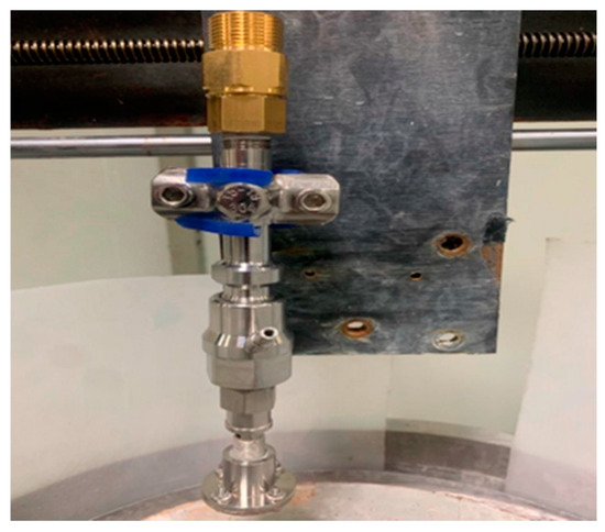 Figure 7 shows the experimental platform for self-excited oscillating abrasive water jets. This experimental platform mainly consists of a high-pressure pump, an abrasive pump, a nozzle, a bucket, a frequency converter, etc. The plunger pump affects how well the jet works. A high-pressure pump with a pressure of up to 25 MPa was chosen. The pure water was pressurized to a set pressure through the high-pressure pump and then stabilized through an accumulator. It was then put into the self-oscillation chamber. At the same time, the abrasive pump extracts the abrasive slurry into the mixing chamber, mixing it with the pure water. A high-pressure abrasive water jet is formed and then enters the self-oscillation chamber. The water-jet-processing equipment and self-oscillation chamber material is CNC-fabricated using 304L stainless steel and designed to last 50 h with less than a five percent change in outlet diameter due to wear. The whole self-excited oscillation nozzle is fixed on the machining spindle, which can adjust the distance and angle. The length of the self-excited oscillation cavity can be changed to make different types of abrasive water jets with different speeds, as shown in Figure 8.