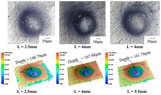 From Figure 10, under the same experimental conditions, the three cavity lengths are able to erode a more obvious pit. The erosion depth in the figure represents the straight-line distance from the lowest point to the highest point in the pit, and the erosion depth is the largest when L = 4 mm, which can reach 167.98 μm, which is consistent with the results obtained from the simulation with a maximum removal rate of L = 4 mm. This proves that the strongest removal ability of the jet is achieved when the cavity length is 4 mm.