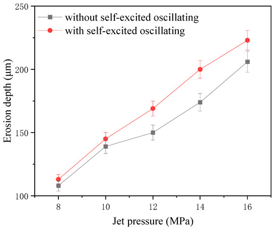 The impact curve is shown in Figure 12. The results of processing using the self-excited oscillating water jet indicate that the impact force at the depth of erosion is greater than that achieved through conventional abrasive water jet polishing methods. The difference between the two depths can reach up to 26 μm, and the depth of the erosion increases when the jet pressure increases. The maximum can be up to 223 μm, which indicates that the pressure of the water jet in the mixing chamber can be converted to the kinetic energy of the abrasive particles. This can be explained by the fact that the pressure energy of the water jet in the mixing chamber is converted into the kinetic energy of the abrasive particles, and the increase in jet pressure directly leads to the increase in the kinetic energy of the abrasive particles, which improves the erosion performance of the individual abrasive particles, i.e., the vertical impact on the surface of the material and the ability to remove the material by shear. This in turn increases the depth of erosion.