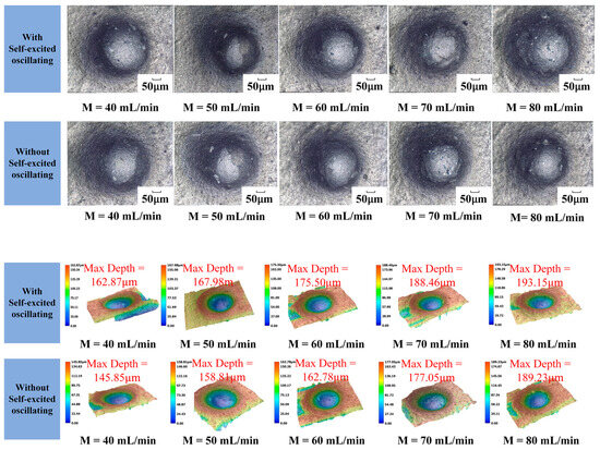 The one-factor experiment of abrasive flow rate was carried out by taking a cavity length of 4 mm, an abrasive grain size of 1000#, a jet pressure of 12 MPa, and the rest of the parameters shown in Table 4. Figure 13 shows the erosion pattern and depth with and without a self-oscillation chamber.
