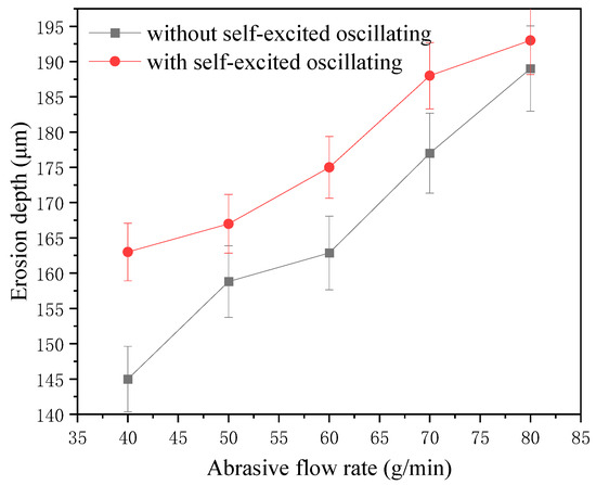The influence curve is shown in Figure 14. It can be seen that the self-excited oscillating method has a greater effect on the depth of erosion than the conventional abrasive water jet polishing method. The difference between the two depths can reach up to 18 μm, the erosion depth increased linearly with abrasive flow in both cases. In the jet system with a self-oscillation chamber, the maximum can be up to 193 μm; this is because the abrasive flow rate directly determine the number of abrasive particles participating in erosion per unit time. This also promotes the interaction between the abrasive particles, thus changing the total kinetic energy of the particles. When the jet pressure and the particle size are both of a certain amount, the abrasive flow increases. On the one hand, this can improve the total kinetic energy of the particles, but on the other hand, it will also increase the possibility of mutual collision between the particles. These changes will result in energy loss, leading to a decrease in the corrosion performance of abrasive particles.