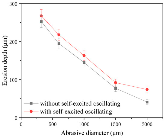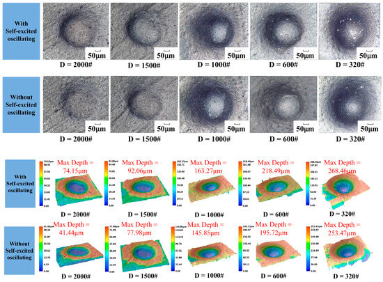 The one-factor experiment of abrasive grain size was carried out by taking a cavity length of 4 mm, an abrasive flow rate of 50 mL/min, a jet pressure of 12 MPa, and the rest of the parameters shown in Table 4. Figure 15 shows the erosion pattern and depth maps with and without the self-oscillation chamber.