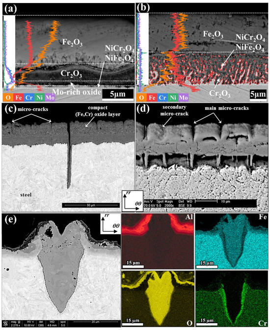 SEM–BSE and SEM–EDS line scan images of different steel types: (a) 3Cr3Mo2NiW steel; (b) 3CrNi3Mo steel []. Cross-sectional SEM images of mold steel specimens after 30,000 thermal fatigue cycles: (c) before electrolytic etching; (d) after electrolytic etching. (e) Cross-sectional scanning electron microscope image of microcracks formed on a coated sample after 30,000 thermal fatigue cycles, and SEM images of Al, Fe, O, and Cr distributions [].