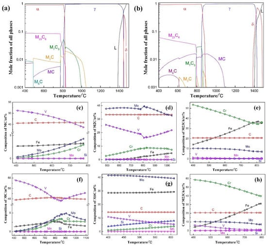 The stability of the phase with increasing temperature under equilibrium conditions: (a) 5Cr5Mo2 steel; (b) H13 steel. Elemental change curve of related phases of the 5Cr5Mo2 steel: (c) MC; (d) M2C; (e) M23C6; and the H13 steel: (f) MC; (g) M6C; (h) M23C6 [].
