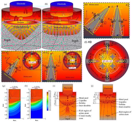 Schematic diagram of the mechanism of different remelting processes: (a) ESR; (b) MC-ESR. The effect of ASMF on different materials during the remelting process: (c) oblique dendrites; (d) axial dendrites; (e) molten pool; (f) top view []. Molten pool profiles during different remelting processes: (g) ESR; (h) ESR-CDS. Schematic diagram of solidification behavior during different remelting processes: (i) ESR; (j) ESR-CDS [].