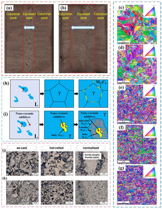 Macroscopic images of SA 106B carbon steel: (a) without nano-TiC particle addition; (b) with nano-TiC particle addition []. Inverse pole figure (IPF) map of RAFM steel with different ZrC contents: (c) 0 wt.%; (d) 0.25 wt.%; (e) 0.5 wt.%; (f) 0.75 wt.%; (g) 1.0 wt.% []. Schematic diagram of the microstructure evolution of 310S stainless steel during the solidification process: (h) without nanoceramic particle additives; (i) with nanoceramic particle additives []. Schematic diagram of the microstructure of SA-106B carbon steel after casting, hot rolling, and normalizing: (j) without adding TiC; (k) adding 0.1 wt% TiC [].