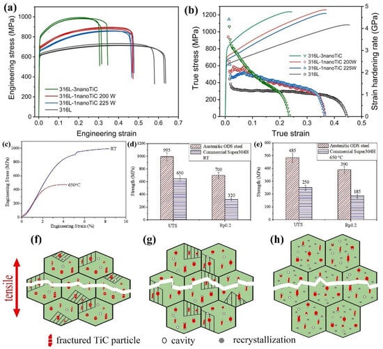 Stress–strain curves of stainless steel with different contents of nano-TiC-316L: (a) engineering stress–strain curve; (b) real stress–strain curve []. (c) Strain–stress curve of austenitic steel at room temperature and 650 °C. Comparison of the strength of Y2O3-reinforced austenitic heat-resistant steel and commercial Super304H steel at different temperatures: (d) room temperature; (e) 650 °C []. Schematic diagram of fracture of TiC-reinforced high-temperature martensitic steel at different temperatures: (f) 25–500 °C; (g) 500–600 °C; (h) >600 °C [].