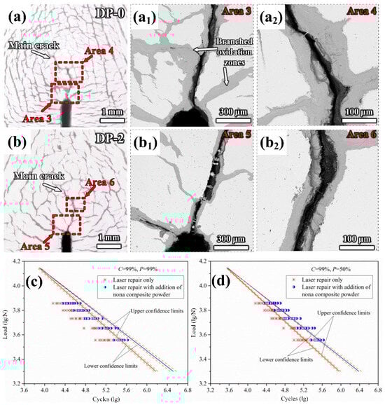 Microscopic diagram of thermal fatigue cracks at the preset notch tip of the new high Cr martensitic mold steel after 3000 thermal fatigue cycles at 650 °C to 20 °C: (a) without adding nanoparticles; (b) adding 0.02 wt.% TiC+TiB2 []. Probability S–N curve at the specified level: (c) confidence (C) = 99%, probability (P) = 99%; (d) C = 99%, P = 50% [].