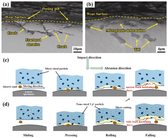 Shan et al. [] studied the wear properties of high-manganese steel reinforced with micron-scale and nano-scale V2C carbides. A high-manganese steel strengthened with two sizes of particles was obtained by different heat treatment processes and the wear mechanism diagrams of two different strengthened steels are shown in Figure 10c,d, respectively. The micron-sized particles can effectively protect the matrix from wear in the early stages of wear. However, large-sized particles are prone to cracks and more likely to fall off the surface, which will seriously deteriorate the wear resistance of the test steel. In contrast, a large number of nanoscale particles with smaller sizes are evenly distributed in the matrix, which can effectively improve the wear resistance of test steel and provide support for micron-sized particles. Micron-sized particles that are more difficult to shed further enhance the wear resistance of the test steel.