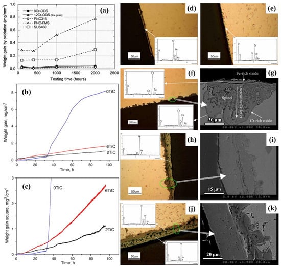 (a) Images of weight changes over time of different test steels at 1023 K []. Weight changes in 304SS steel with different TiC contents: (b) weight change curve with time (c) parabolic graph of weight change with time. Oxidation cross-sectional images of different TiC contents at different times: (d) 304SS, 48 h; (e) 304SS–6TiC, 48 h; (f,g) 304SS, 96 h; (h,i) 304SS–2TiC, 96 h; (j,k) 304SS–6TiC, 96 h [].