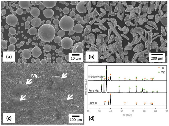 Figure 1. FESEM micrographs of (a) Ti powder, (b) Mg powder, and (c) the Ti-30Mg mixed powder obtained from (a,b). (d) XRD patterns of the powders.