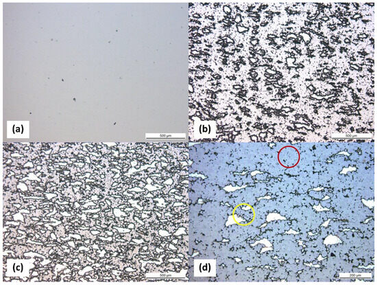 Figure 2. Optical micrographs of (a) Pure Ti, (b) Ti-30Mg, and (c) Ti-50Mg samples. (d) Enlarged optical micrographs of Ti-30Mg.