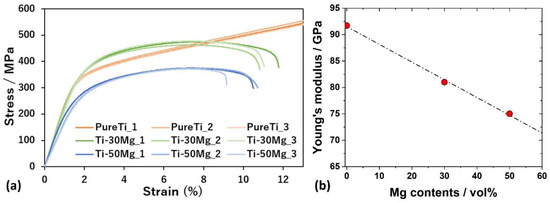 Figure 4. (a) Compressive stress–strain curves of pure Ti, Ti-30Mg, and Ti-50Mg. (b) Relationship between Mg content and Young’s modulus.