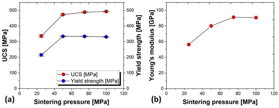 Figure 6. (a) Changes in UCS and Yield strength with variations in sintering pressure. (b) Relationship between sintering pressure and Young’s modulus.