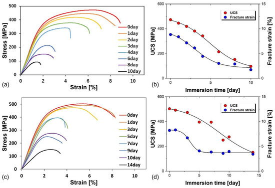 Figure 8. Compressive stress–strain curves of Ti-30Mg samples with (a) 50 MPa and (c) 100 MPa of sintering pressures immersed in saline for various times up to 10 days. Changes of UCS and fracture strain of Ti-30Mg with (b) 50 MPa and (d) 100 MPa of sintering pressures increasing immersion times in saline for up to 10 days.