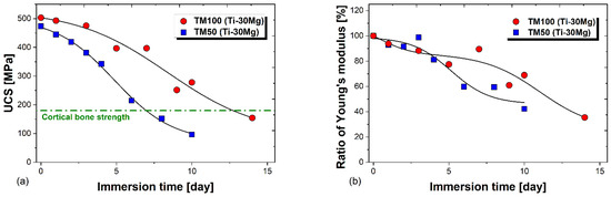 Figure 9. (a) Relationship between UCS and immersion time of TM100 (Ti-30Mg) and TM50 (Ti-30Mg). (b) Changes in the ratio of Young’s modulus to the initial Young’s modulus with an increase of the immersion time for TM100 (Ti-30Mg) and TM50 (Ti-30Mg).