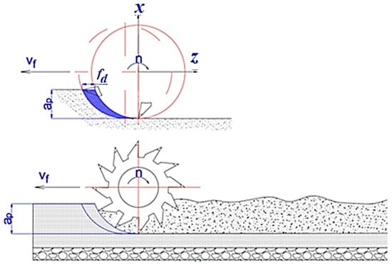 Milling schematization: n—milling drum rotation speed, rpm; vf—speed in the advanced direction, m/min; ap—milling depth, mm; fd—tooth advance, mm/tooth [3].