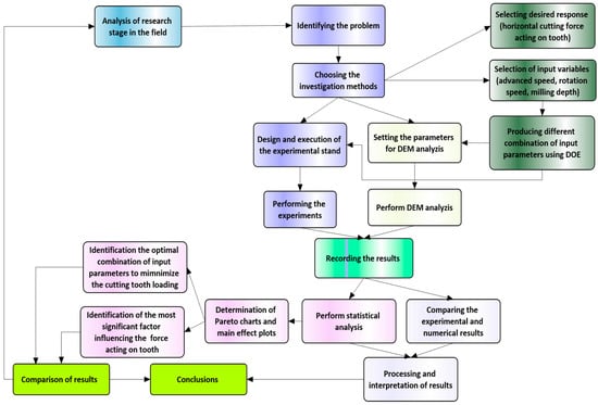 In parallel, numerical simulations based on the Discrete Element Method (DEM) were conducted to complete the experimental findings. DEM offers a computational framework to model the complex interactions between milling tools and asphalt concrete, allowing for the prediction of horizontal resistance forces under different cutting conditions. By comparing experimental results with numerical simulations, this study aims to validate the efficacy of DEM in simulating the asphalt milling process and analyze its potential for further investigations (Figure 2 shows the steps in the present work).