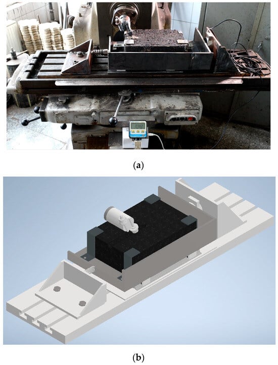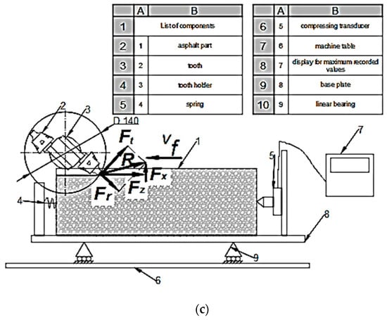 In the scope of the experimental studies in laboratory conditions, the special stand presented in Figure 3 was designed, having the characteristics in Table 1. The stand reproduces the real conditions, from the point of view of the elements that participate in the milling process. During the construction of the stand, teeth taken from real milling cutters were used to make the milling cutter, and the processed part was represented by asphalt concrete blocks having the composition of the asphalt coating. The milling process was analyzed by investigating the interaction between a single cutting element (a single tooth of the milling cutter, knowing that, in practice, asphalt milling involves one or two teeth for each cross-section relative to the milling axis) of the milling drum and the asphalt sample. This approach facilitated the determination of the reaction forces during the cutting process, as well as the ability to adjust various geometric and dynamic parameters of the cutting processes over a wide spectrum, including milling depth, rotational speed, and the speed and direction feed rate of the displacement of the milling cutter. Asphalt concrete samples were used for the experiment. They were made of asphalt concrete having the same composition (Table 2) as the asphalt concrete used in the manufacture of roads (asphalt concrete samples were taken from a batch manufactured at the Strabenbau Logistic asphalt station). The asphalt concrete samples were cast and compacted in molds with dimensions of 350 × 240 × 100 mm. After formatting, the samples were kept in the ambient atmosphere for 240 days, in order to obtain a natural asphalt consistency (corresponding to road surfaces).
