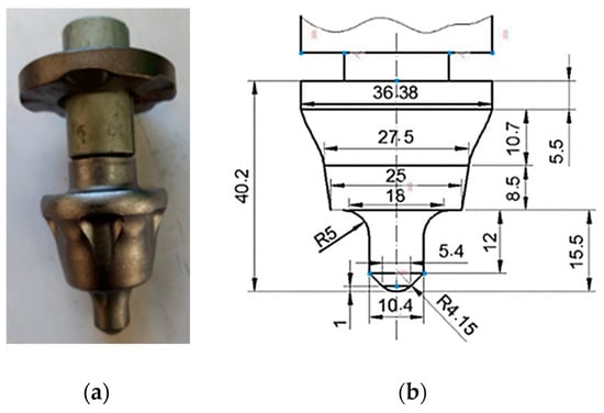 The geometry of milling cutter tooth: (a) real Wirtgen tooth; (b) dimensions (in mm) [3].