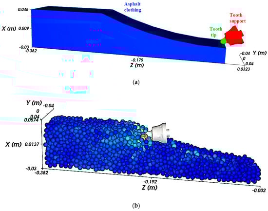 The numerical investigation performed was the Discrete Element Method (DEM) with Rocky 2022 R2 software. To enhance computational efficiency, spherical particles with a diameter of 8 mm were employed. All details regarding the setting for the numerical simulation can be found in our previous paper [3]. Geometrical models for DEM simulations of both tooth and asphalt were generated using the Space Claim module (as shown in Figure 6).