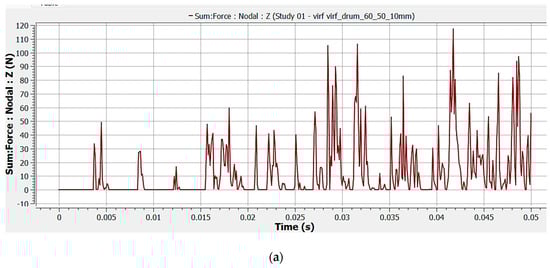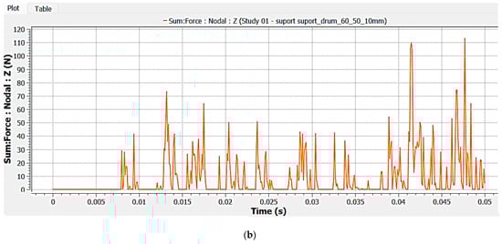 In DEM analysis, the values of cutting forces were determined in the Oz direction (the horizontal direction that coincides with the advance direction), both for tooth support and tip (one example is presented in Figure 9), and the total force was determined by summing them. The cutting forces were established by identifying the peak values obtained from summing the forces during the simulation of the milling process.