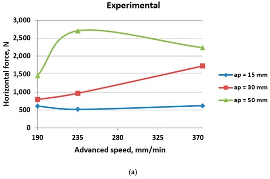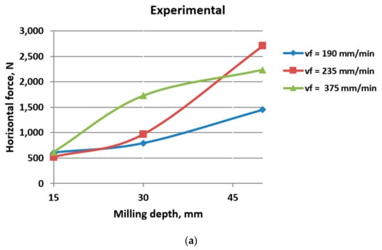 The first investigation was performed considering the same milling depth ap = 30 mm and different values of rotation speed and advanced speed. The results of horizontal cutting force, obtained experimentally and numerically, are presented in Table 5 and Figure 8.