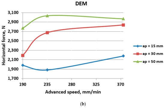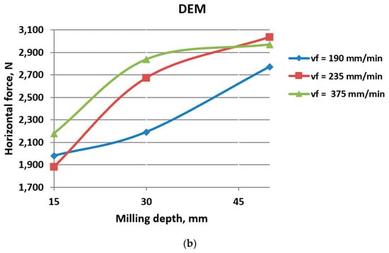 The procedure for carrying out the experimental tests assumed the establishment of operating conditions (milling) in correlation with the operating possibilities of the machine tool, on the basis of which the experimental device was designed. In this sense, the first experimental program was based on the use of 30 mm milling depth, performing milling operations using a range of six distinct values for advance speed: 30, 75, 118, 190, 235, 375 mm/min, and three values for the rotation speed: 30, 75, 300 rpm. The experimental results obtained—in the form of the horizontal component of the cutting force (milling)—were compared with the results obtained from the DEM modeling of the milling process, under the conditions of using the same working parameters as during the experiment. The purpose of this comparison was to establish the extent to which DEM modeling can be used to estimate the forces developed in milling. A second experimental program used a single rotation speed—75 rpm—changing the values of the milling depth—15, 30, 50 mm—and the advanced speed—190, 235, 375 mm/min—in order to establish the contribution of each of the two parameters on the value of the horizontal force during milling operation.