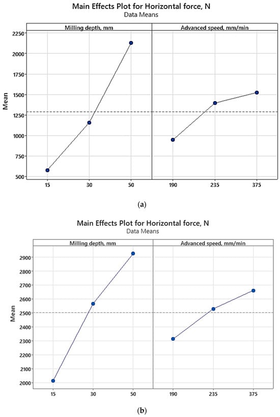 This alignment underscores the robustness of the observed trends and reinforces the significance of milling parameters, such as depth and advanced speed on horizontal cutting force. Such convergence between experimental and numerical results enhances confidence in the validity of the findings and lends further credence to the importance of optimizing milling parameters for minimizing cutting force in machining processes.