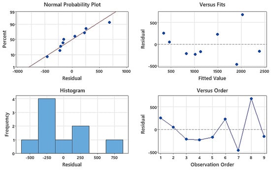 The data from Table 8 show that the interaction term (Milling depth · Advanced speed) has a p-value of 0.695, which is significantly greater than the common level of 0.05. This indicates that there is no significant interaction between the input variables. The contribution of 0.63% indicates that the interaction term between milling depth and advanced speed explains a very small part of the total variation in the response variable. This minimal contribution, along with the high p-value (0.695), justifies the exclusion of the interaction term from the model, leading to a simpler and more interpretable model focusing on the significant main effects.